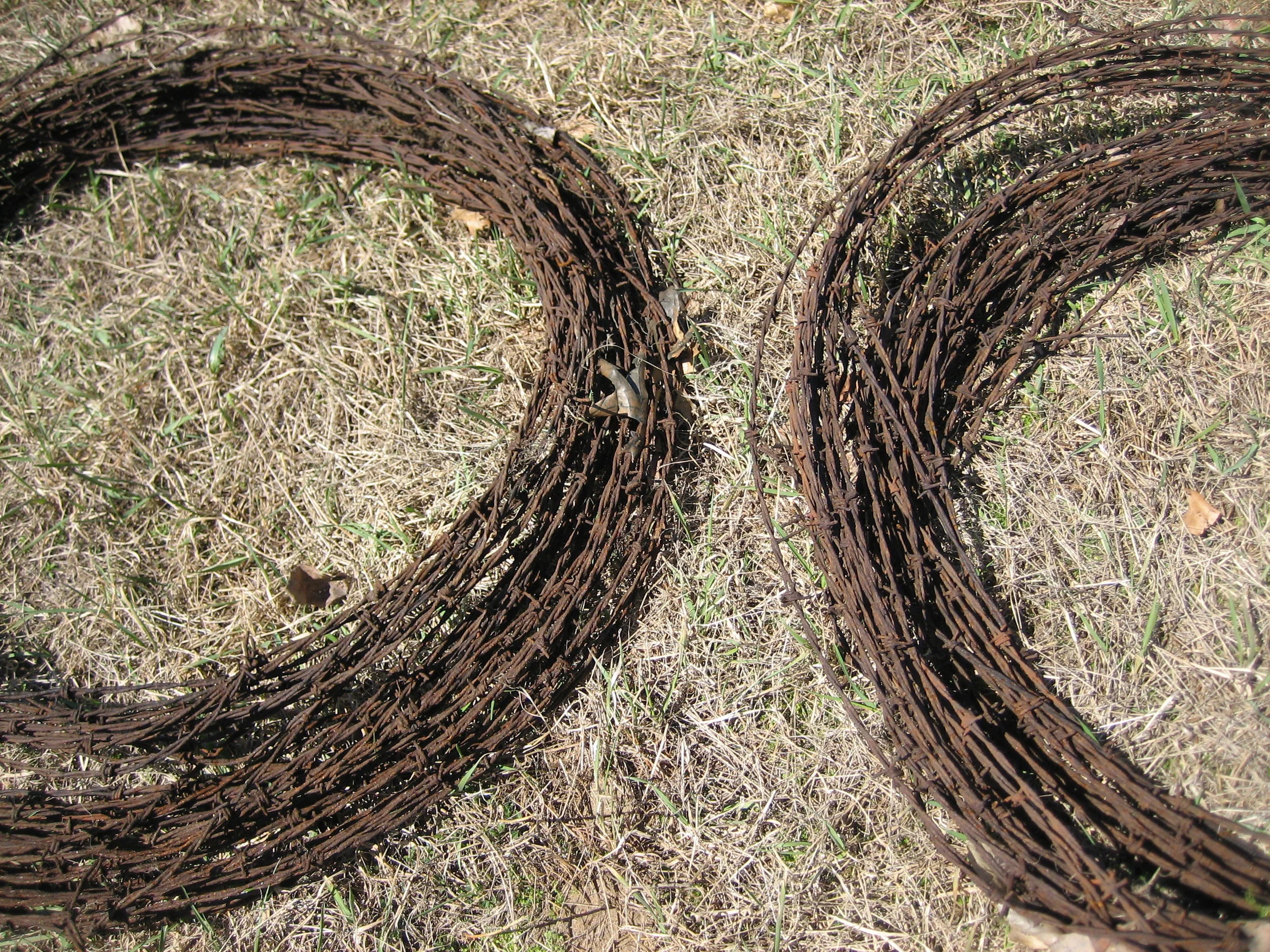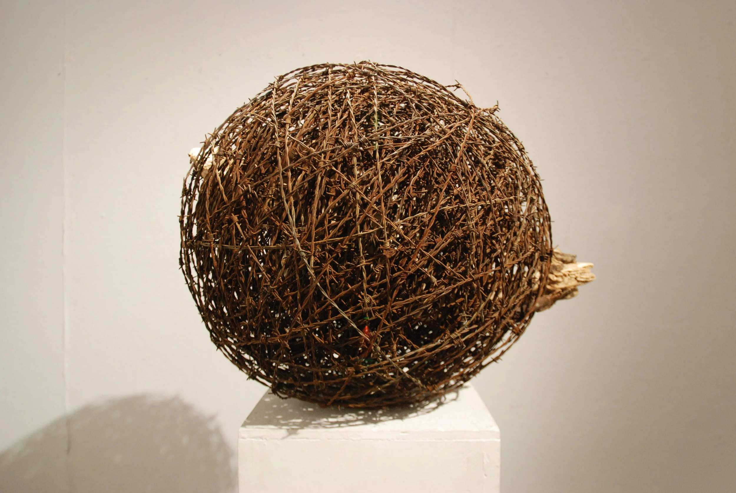 In the middle of a field at Hampshire College, a juniper tree was succumbing to the weight and shade from a host of invasive vines. The farmer mowed around the tangled mess, creating an island of spiky chaos. I felt moved to save the juniper, if only temporarily. Over a few days I cut back the razor sharp rose and buckthorn, separating the material before confining it into a sphere. The tree was liberated. Yet even as I finished the piece, new shoots had emerged, ready to climb again.
